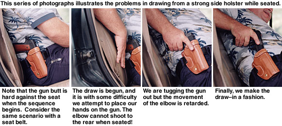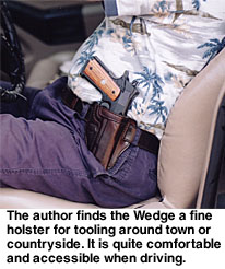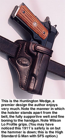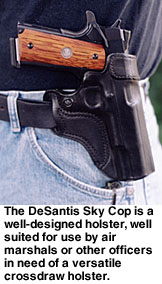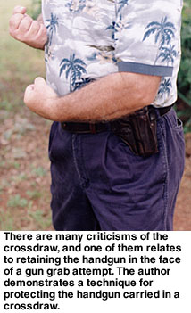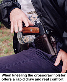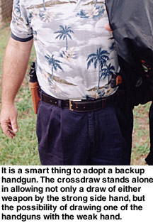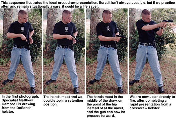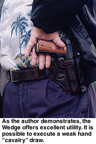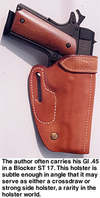Contributing Editor When someone tells you they like a holster, then you should ask them if they like the draw as well. They may be perplexed, but this is a fair question. We need not refer to the Professional or the DOJ as a strong side holster as they obviously are, but the crossdraw, why, there it is in your face. It is a cross draw. You may strap the holster on and be quite happy with the way it feels and how it balances Old Loudmouth. But if you are not confident with the actual draw, meaning the deployment of the handgun, you are hapless. The crossdraw holster is demanding of time but once the advantages of the type are understood, it is a holster that is appreciated. The trick is understanding the crossdraw. For my part, that is a long story. I admit much of my early fascination with this type of carry was predicated upon the media and photographs of a certain Southern sheriff of some fame carrying his handgun crossdraw style. The first holster I hand-crafted was a crossdraw. It was nothing to brag about but I enjoyed it. Then came my first uniform and formal training. Wearing a Smith & Wesson Model 28 to my first revolver class—and it was all revolvers in those days—I was warned that no uniformed officer was allowed to carry a crossdraw holster. (At that time, Boise, ID, and a few other agencies issued the crossdraw but I was the low man on the totem pole and not ready for an argument my first day on the range.) The disadvantages of the crossdraw were pointed out forcibly. 1. The crossdraw holster draw is across the target, not through the target. In other words, if you draw from a strong side holster you will be drawing into the target, and if you fire too soon you may hit the target in the lower body. Fire too late and you may hit him in the neck—with the crossdraw you are sweeping across a fairly narrow stretch of the body with more possibility of a miss. ![]() 3. The crossdraw draw presents the handgun in a manner that allows the gun to be grasped by a gun grabber practically as easily as by the wearer himself. All of these criticisms were taken to heart and it was many years before I questioned their validity. They were correct as far as they went, but predicated upon facing a stationary target that we were squared to. This was not a very realistic scenario. Time passed, and I was carrying a .45 auto while in a position as patrol lieutenant and able to carry pretty much anything I wished. But I never seriously considered a crossdraw holster until a friend showed me his. He had taken it from a gang leader, and it was among the first Gordon Davis holsters I had seen. The Liberty The Liberty is quite a holster, well made and ideally suited for all around use. The man who had owned the holster used it to carry his .45 auto while riding a Harley. The ability to draw the handgun while seated was important to this man, as was comfort when riding. I eventually owned several of these holsters and came to a better understanding of the crossdraw. I began to address some of the criticisms of the crossdraw holster and realized these criticisms were at best situational. I still believe the strong side holster is the best choice for duty use and open carry, but for personal defense and concealed carry the crossdraw has many advantages. The first of these is accessibility when seated. Sure, the strong side holster offers a good smooth draw all things being equal, but it depends upon where your hands are when the ball goes up. If you are seated in a vehicle or in an office, you can sit with your hands practically on the gun butt. A strong side holster will bury the butt in the back of a seat. ![]() You can snap into a Weaver stance quickly. You may even turn your body toward a threat you are squared to, enhancing the draw speed and accuracy. Remember, draw speed is not what we are striving for. An accurate first shot hit in the shortest time frame possible is the real goal. If the threat happens to be right on top of you as you are in mid draw, you may be in a very good retention position. The handgun can be kept against the body and the strong side leg to the rear, bracing the body. Otherwise, you can complete the draw and you are in effect drawing into the target. Try it. This technique works! As for the unnecessary movement argument, this is true again if you are squared to a target on the range. But we all know life isn’t a static range. The crossdraw isn’t as fast as the strong side draw in this scenario—no surprises there, but in the above mentioned scenario it is at least equal to the strong side holster. If you are seated or in a vehicle and have to rise to dig for the strong side holster, you may understand the advantages of the crossdraw. A not inconsiderable advantage of the crossdraw is that the weak hand can draw the pistol easily if need be. When going on high risk raids, I often carried my second handgun in a crossdraw. There is really no other choice. Sometimes, the gun in the crossdraw was my primary 1911 with another pistol carried strong side. When working in plainclothes at an agency that issued the SIG P 226, I managed to have a STAR PD .45 approved for backup. The little gun rode crossdraw. It spoke in my favor twice, and as I remember there was nothing lacking in draw speed. Again, it is all situational. The retention problem is more difficult to address. I have consulted a number of men whom I respect on this one, and came away with several viewpoints. The crossdraw holster does seem to present the gun in a way that would make it easier for the gun snatcher to acquire the handgun quickly. Yet, this overlooks the fact that many successful gun grabs take place after the gun is drawn. With so many officers killed with their own gun, this is a valid concern (See Hindsight, GW Dec. 10, 2004). ![]() With the crossdraw, we can drop the weak side arm and cover the gun, holding it against our body, while delivering a blow with the strong side arm. Sounds like it mi